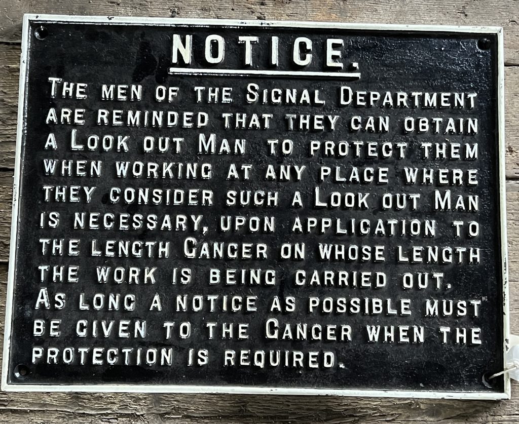 This sign is a message to staff. We do not know the precise circumstances that caused it to be provided and it is the only example that we know of. Still, signs like this usually appeared after some form of accident, and in this case, we hazard a guess that a signal lineman had been hit by a train, so this was provided to remind staff that a look out could be provided if they wished. The KWVR has a similar example from the Great Western Railway, which is located on the inside of the cab of locomotive 5775, which exhorts locomotive crews not to stand on the outside of the locomotive when in motion; again, we can only presume that something awful had happened which caused this reminder to appear.